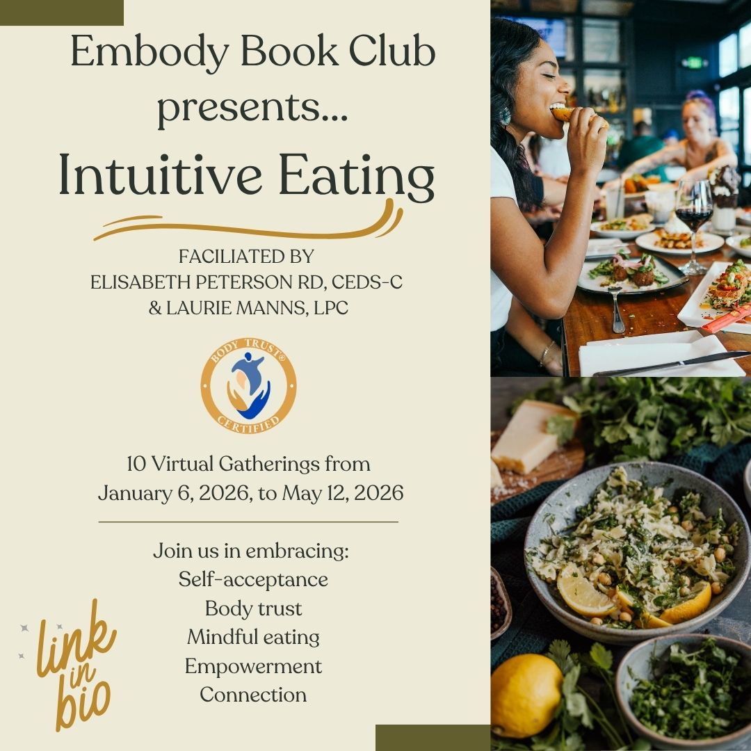 Winter/Spring 2026 we will read and discuss "Intuitive Eating” & “Intuitive Eating Workbook” by Evelyn Tribole and Elyse Resch.